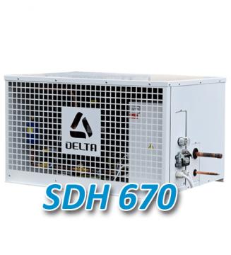 Напольно-потолочная холодильная высокотемпературная сплит система серии SDH - это промышленная холодильная система для хранения медикоментов, свежих и срезанных цветов, охлаждения продуктов и товаров, а также для поддержания температуры в цехах переработки мяса, птицы, рыбы и других производствах. Комплект сплит-системы содержит внутренний блок (воздухоохладитель, испаритель), и наружный компрессорно-конденсаторный блок (ККБ). Эти блоки монтируются на предприятии требующем охлаждения помещений. Воздухоохладитель внутри холодильной камеры или производственного цеха, а ККБ снаружи камеры или здания на пол, потолок или специальную раму. Сплит-системы Delta SDH оснащены электронным контроллером управляющим всеми процессами охлаждения в автоматическом режиме.